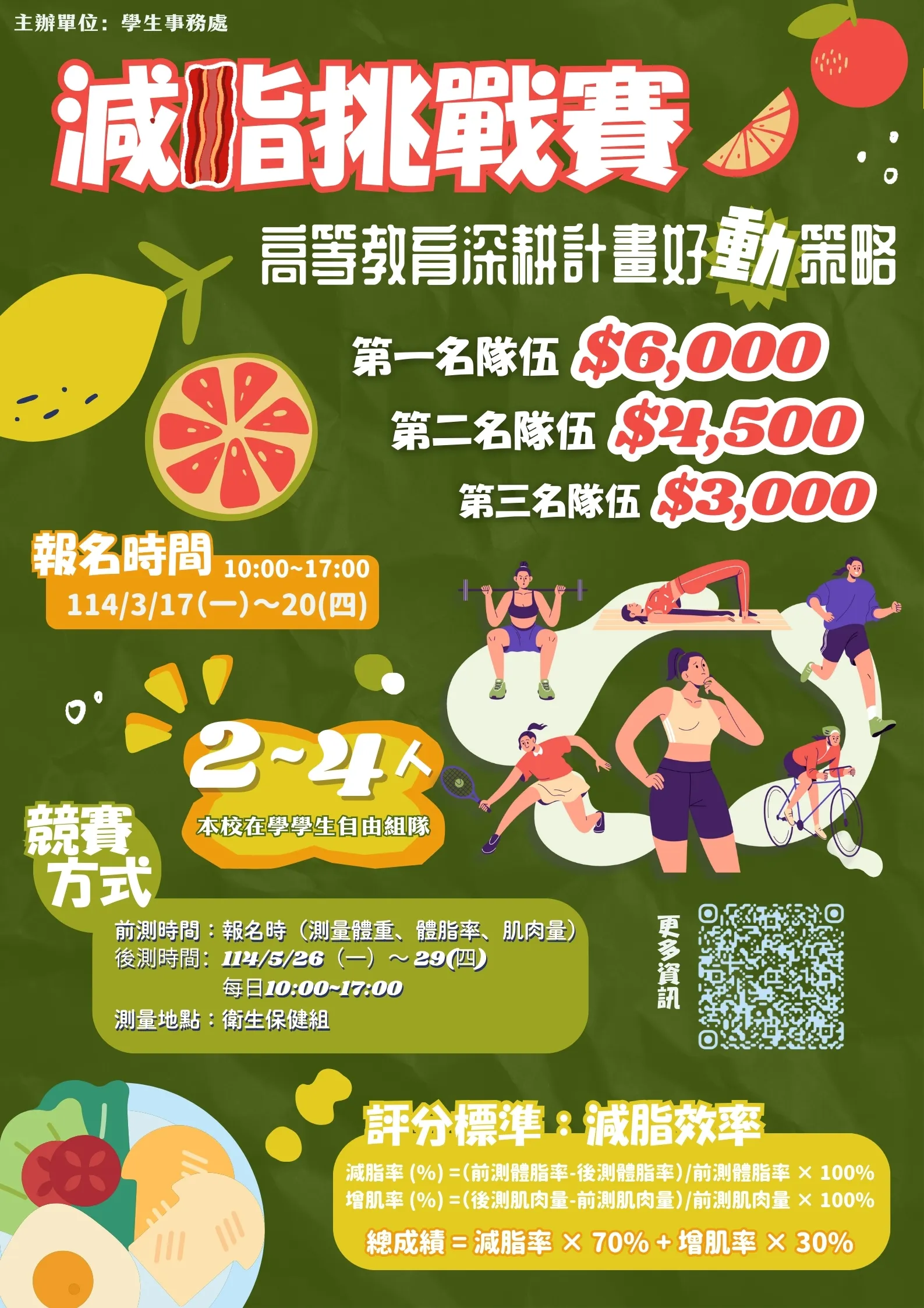 考量計畫目標係為營造健康校園,鼓勵全校學生積極運動健身,故新增「減脂挑戰賽」前測、後測日期,以廣納更多同學報名參與。