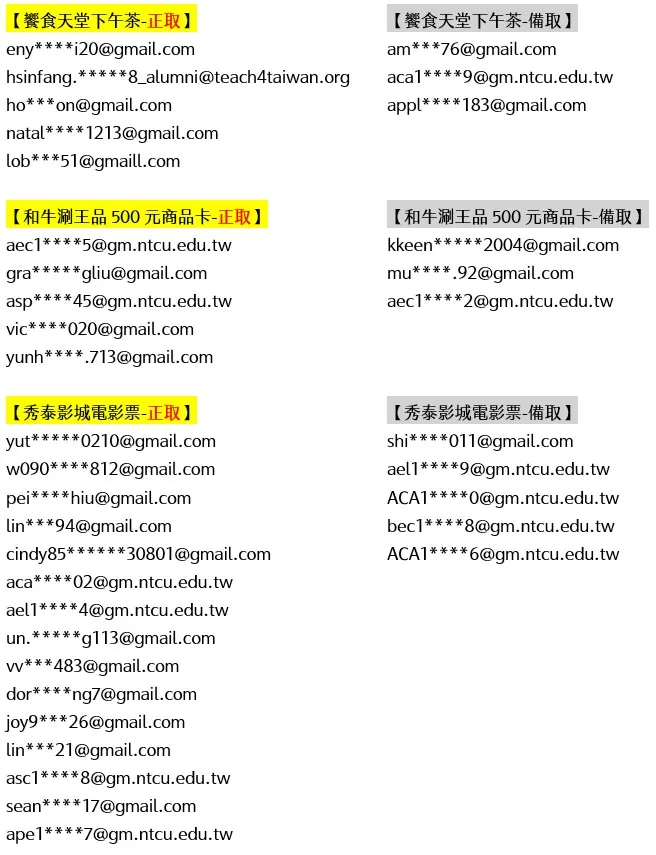 - 若因email填寫錯誤,導致無法成功寄出中獎通知與中獎聯者,將視同放棄中獎資格,主辦單位有權依序遞補其他中獎者,恕不另行通知。